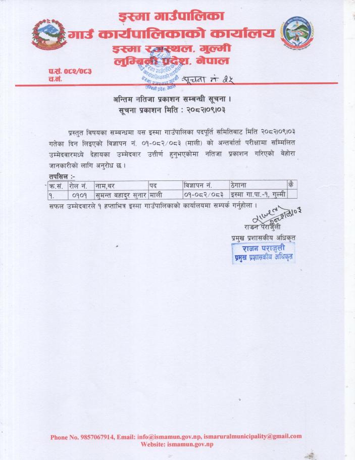 अन्तिम नतिजा प्रकाशन सम्बन्धी सूचना ।