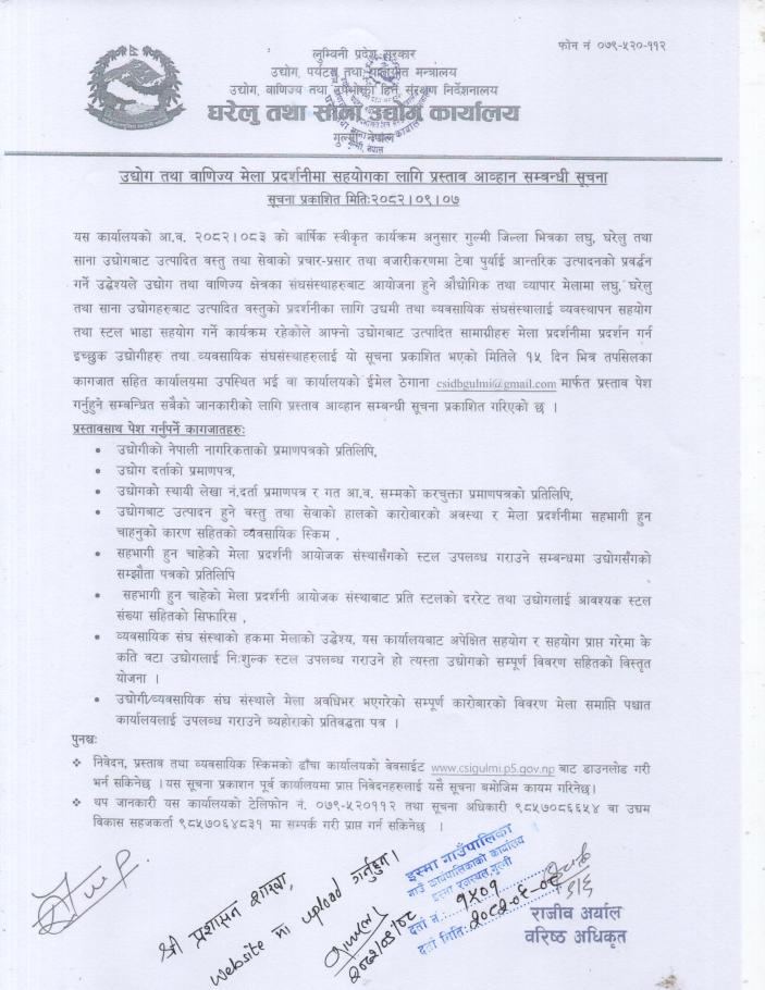 उद्योग तथा वाणिज्य मेला प्रदर्शनीमा सहयोगका लागि प्रस्ताव आव्हान सम्बन्धी सूचना ।