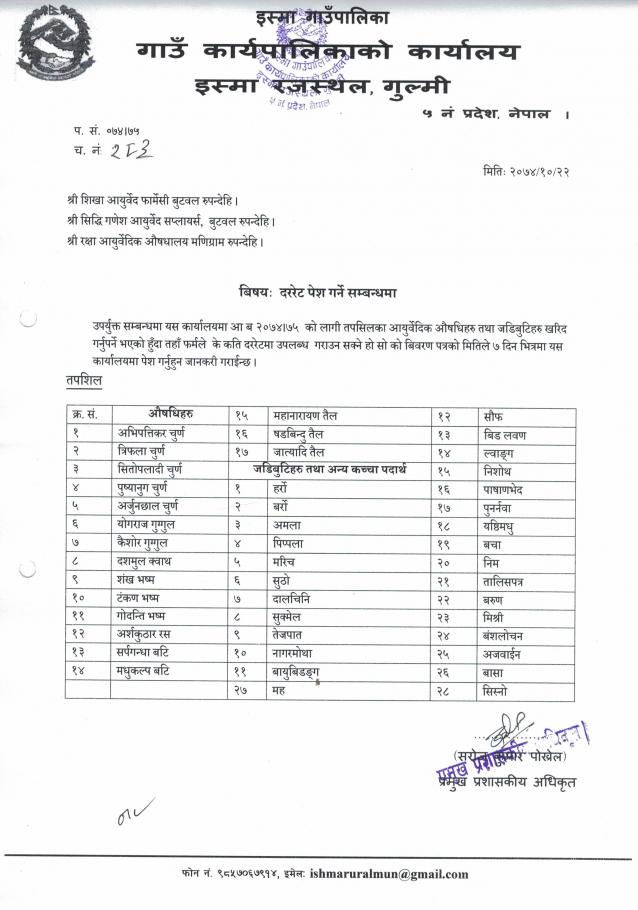 आयुर्वेदिक औषधिहरु तथा जडीबुटीहरुको दररेट पेश गर्ने सम्बन्धमा