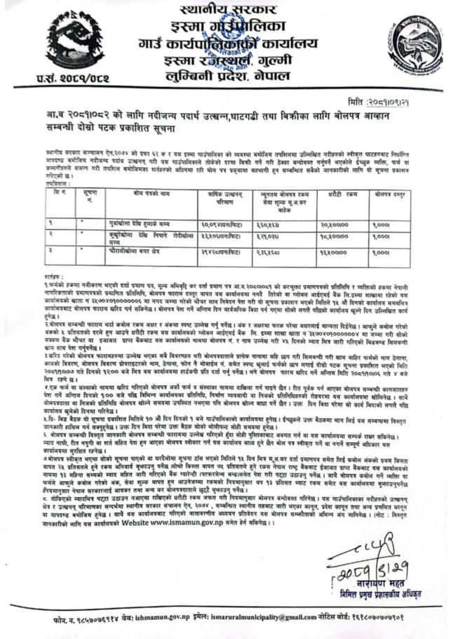 आ.व २०८१।०८२ को लागि नदीजन्य पदार्थ उत्खन्न, घाटगद्धी तथा बिक्रीका लागि बोलपत्र आव्हान सम्बन्धी दोस्रो पटक प्रकाशित सूचना ।