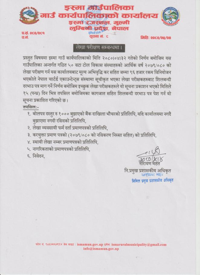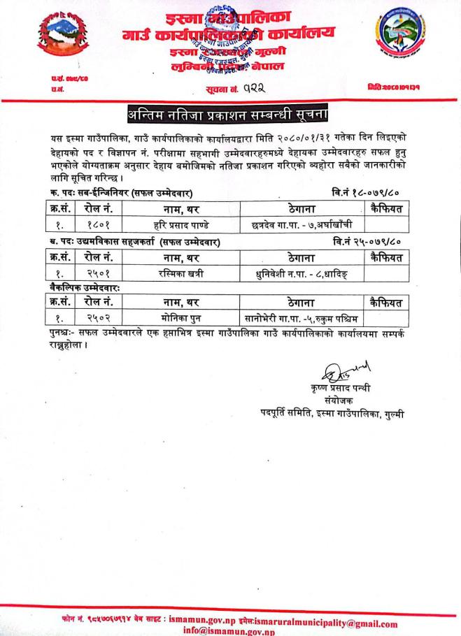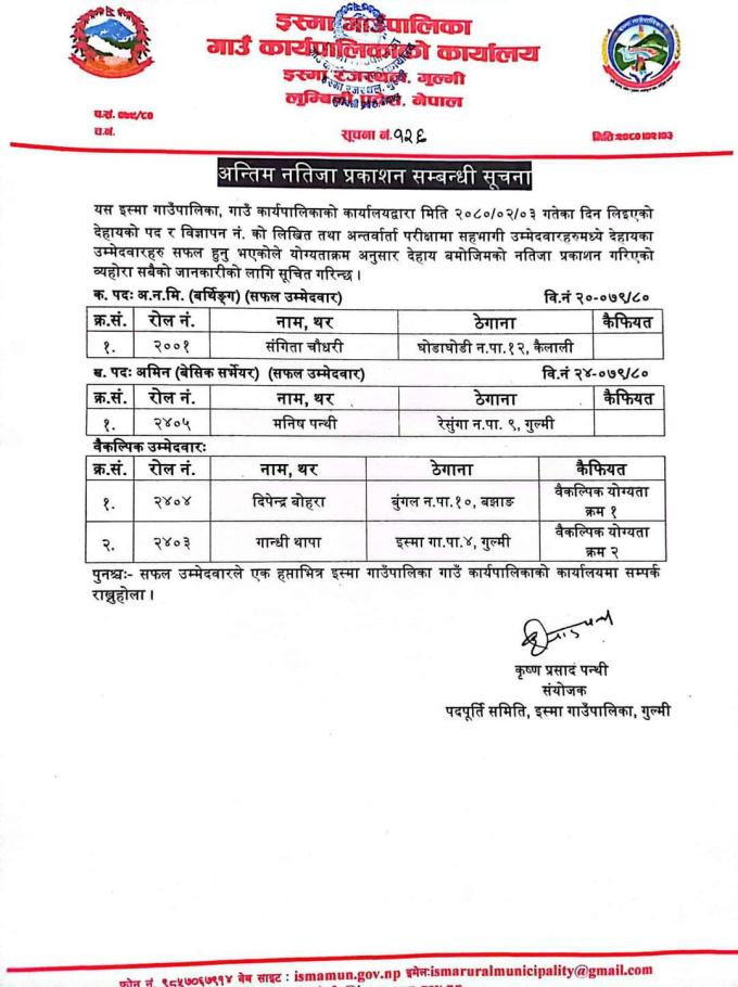 | वार्ड न. ५ इस्मा रजस्थल | झविन्द्र अर्याल | ९८५७०५७३०५ |