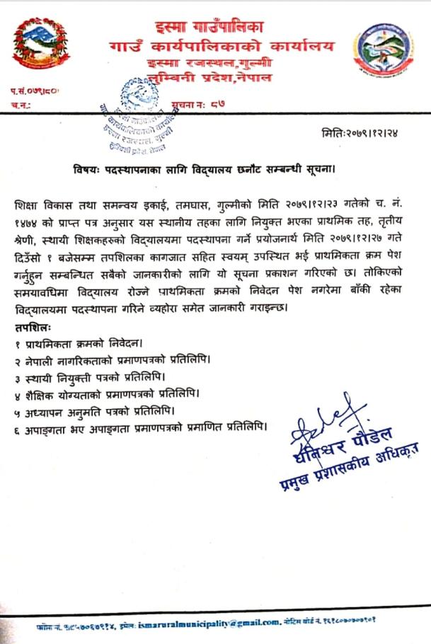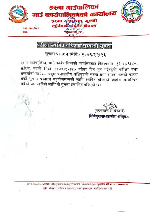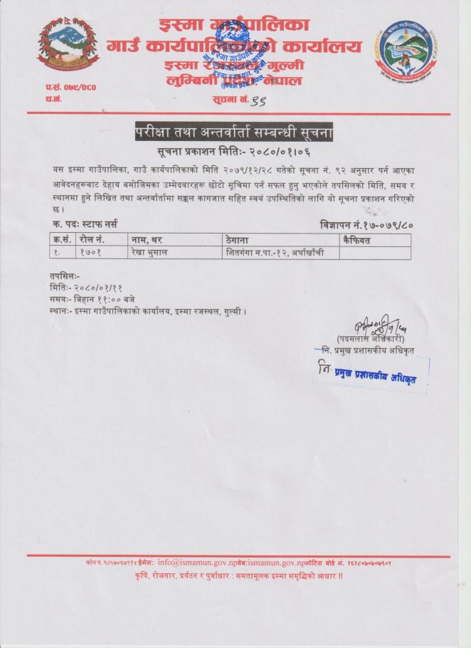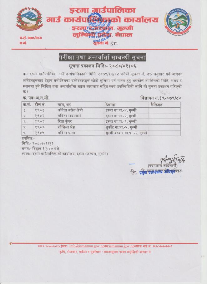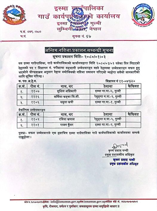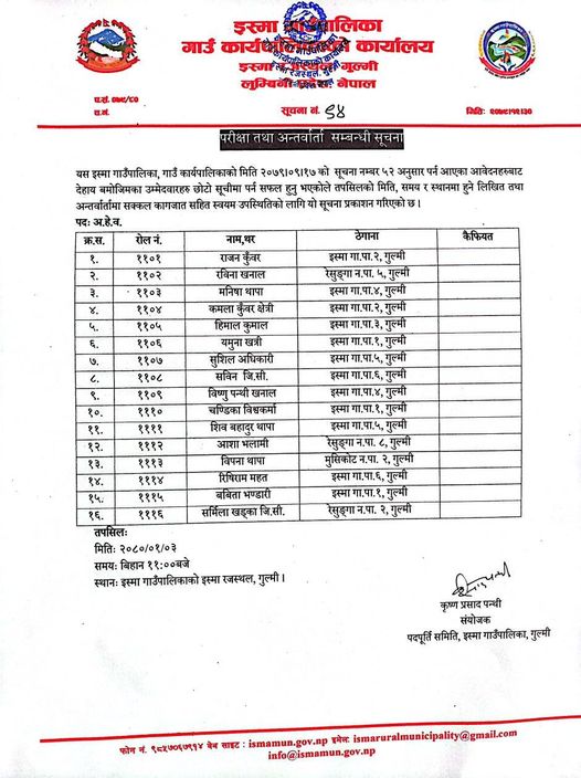| वार्ड न. ५ इस्मा रजस्थल | झविन्द्र अर्याल | ९८५७०५७३०५ |
