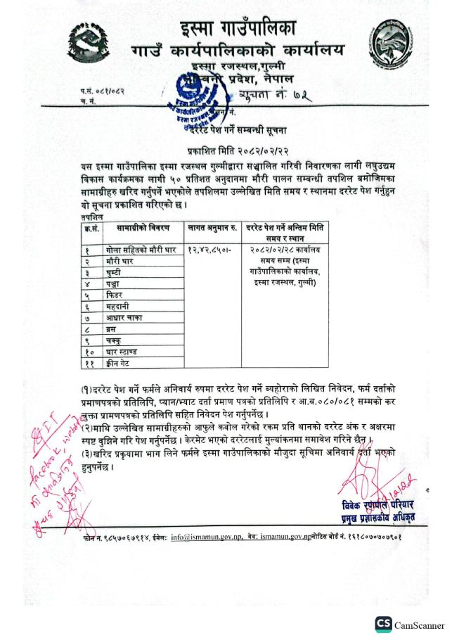 | वार्ड न. ५ इस्मा रजस्थल | झविन्द्र अर्याल | ९८५७०५७३०५ |