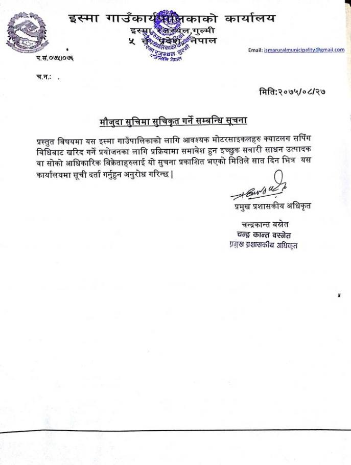 इस्मा गाउँपालिका द्वारा १ थान पल्सर १५० सि.सि. मोटरसाईकल हस्ताचौर प्रहरी चौकी लाई प्रदान गरियको छ| एक समारोहका बीच इस्मा गाउँपालिका अध्यक्ष श्री लक्ष्मन बहादुर बिष्टले इस्मा प्रहरी चौकी प्रमुख सहि विजय पाल तिवारी लाइ मोटरसाईकल को चापी हस्तान्तरण गर्नुभएको हो| हस्तिचौर प्रहरी चौकीले सवारी साधनको अभाबमा कार्यसम्पादन गर्न अप्ठयारो रहेको पटक पटक गुनासो गरेकाकारण मोटरसाइकल उपलब्ध गराईएको उपाध्यक्षको भनाइ| सो आवस्थालाइ मध्यनजर गर्दै गाउँपालिकामा चलनमा रहेको लु १ ब १०७५ नम्बरको मोटरसाइकल प्रदान गरियको हो |