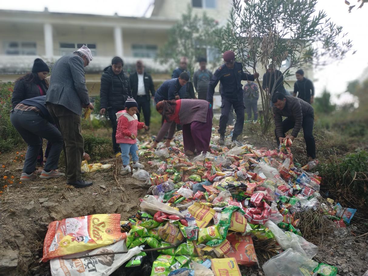 गाउँपालिकाको वडा नं ३, ४ र ५ का मुख्य बजारहरुमा अनुगमन गर्दा म्याद सकिएका तेल, आटा, चाउचाउ, पेय पदार्थ, सोयाबिन, बिस्कुट, कुरमरे लगायतका खाद्य तथा पेय पदार्थ अनुगमन समितिले नष्ट गरेकाे छ|