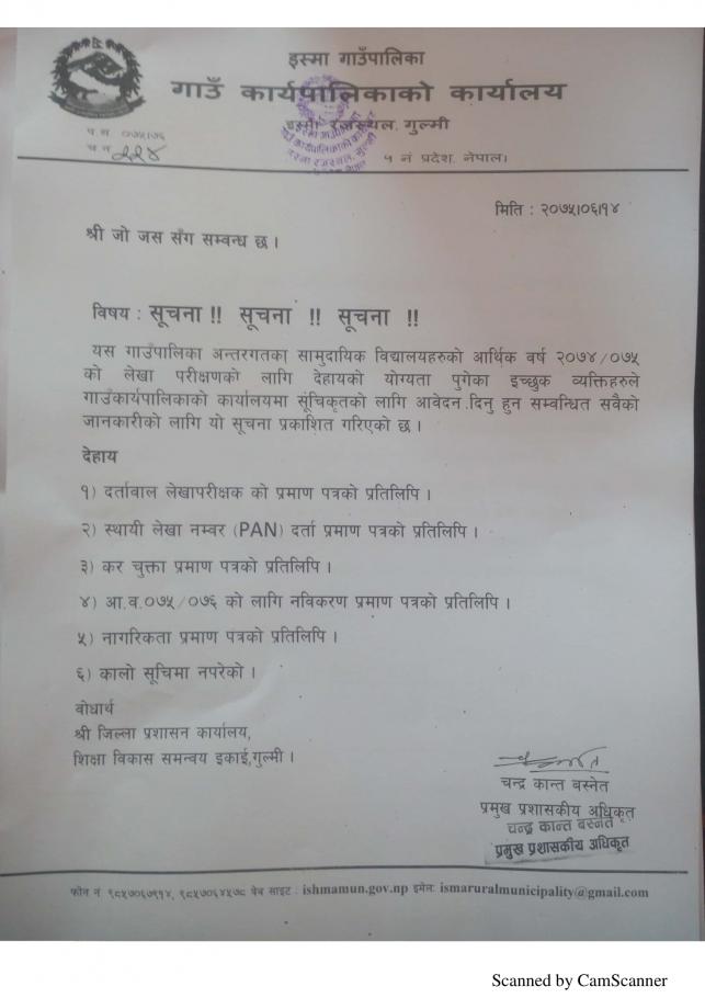 इस्मा गाउँपालिका वार्ड नं.१ मा रहेको हिमालय मा.बि.मा शिक्षक आबश्यकता सम्बन्धि सूचना!