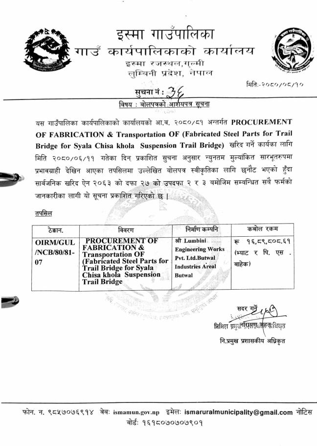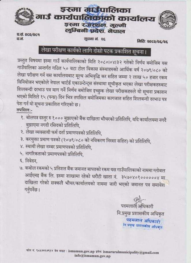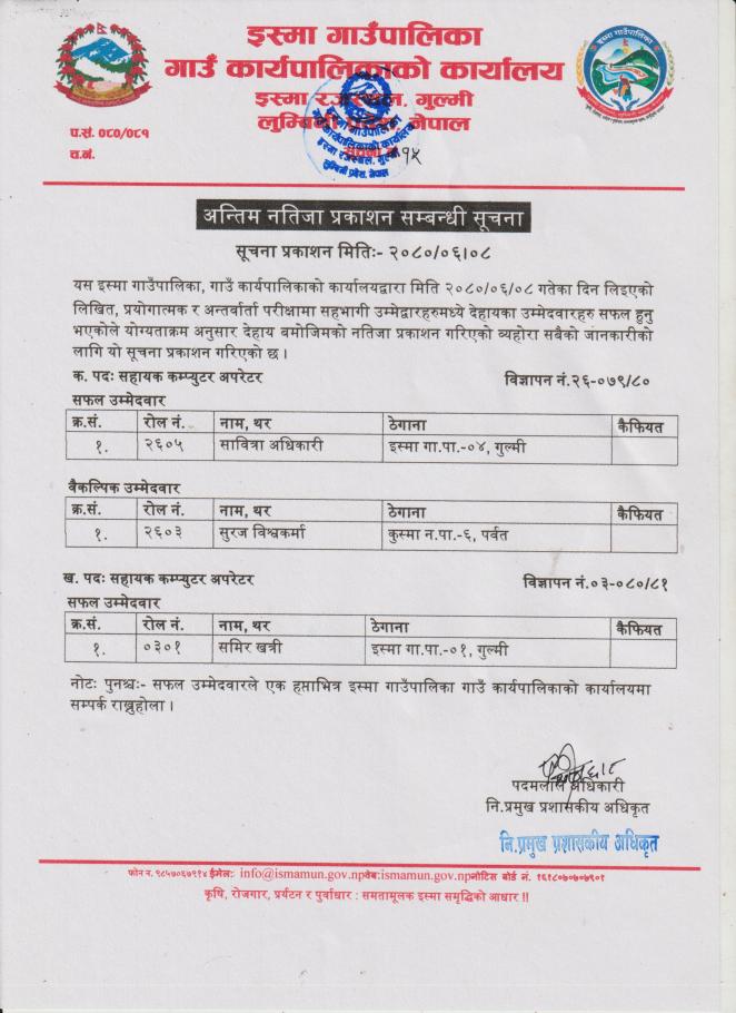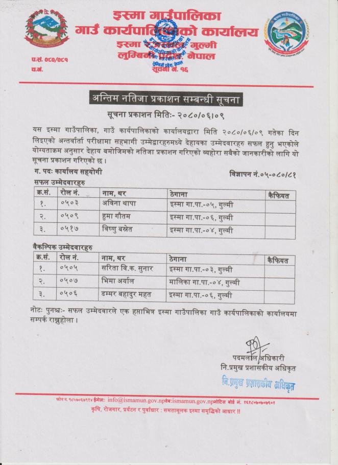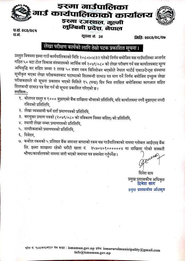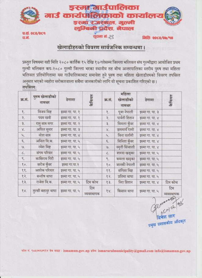 | वार्ड न. ५ इस्मा रजस्थल | झविन्द्र अर्याल | ९८५७०५७३०५ |