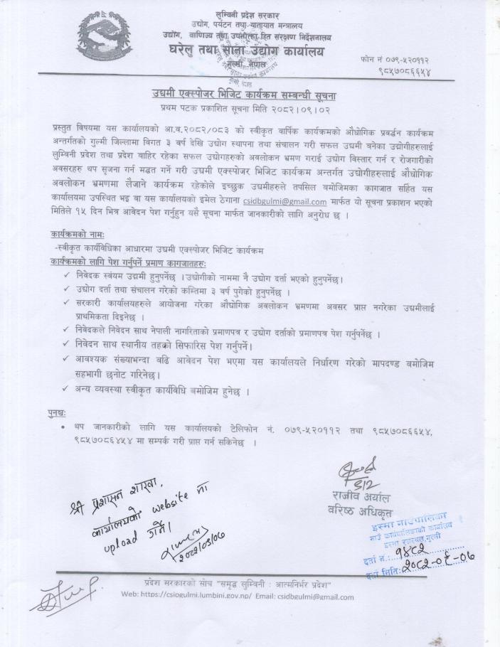 उद्यमी एक्स्पोजर भिजिट कार्यक्रम सम्बन्धी सूचना ।